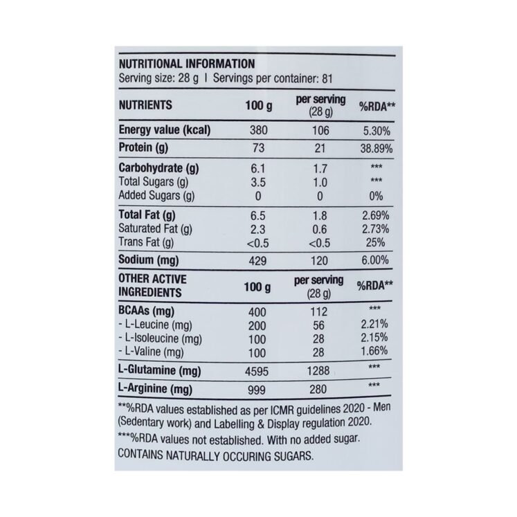 100% Pure Whey is a high-quality protein powder with high biological value and its protein content is 100% derived from whey protein. It is a combination of whey concentrate, whey isolate, and added amino acids L-arginine, and BCAAs).