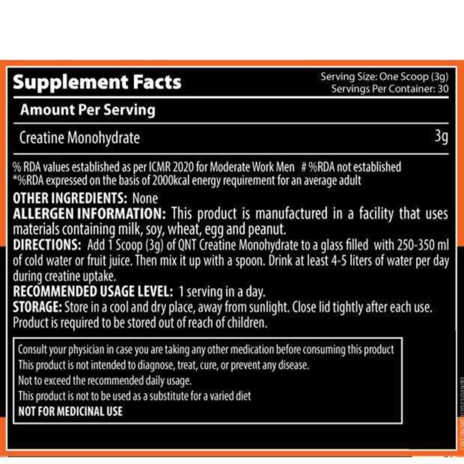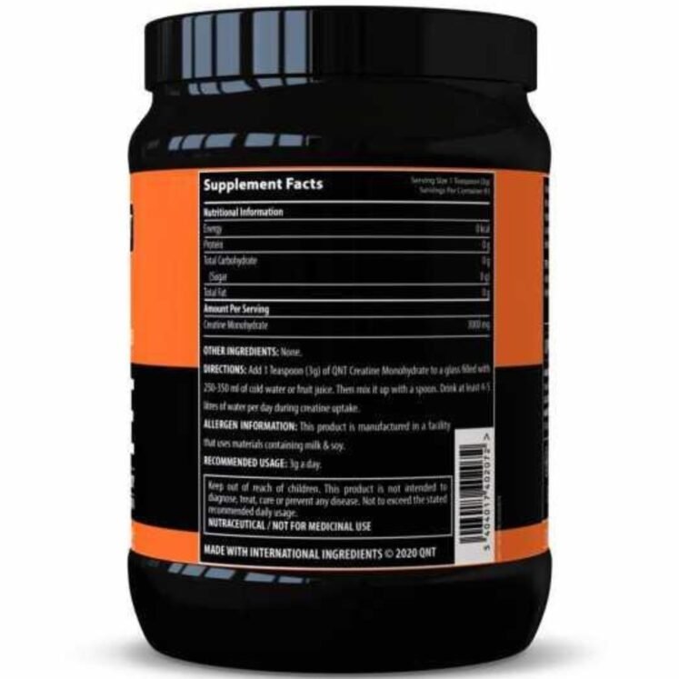 Add 1 Teaspoon (5g) of QNT Creatine Monohydrate to a glass filled with 250-350 ml of cold water or fruit juice. Then mix it up with a spoon. Drink at least 4-5 litres of water per day during creatine uptake